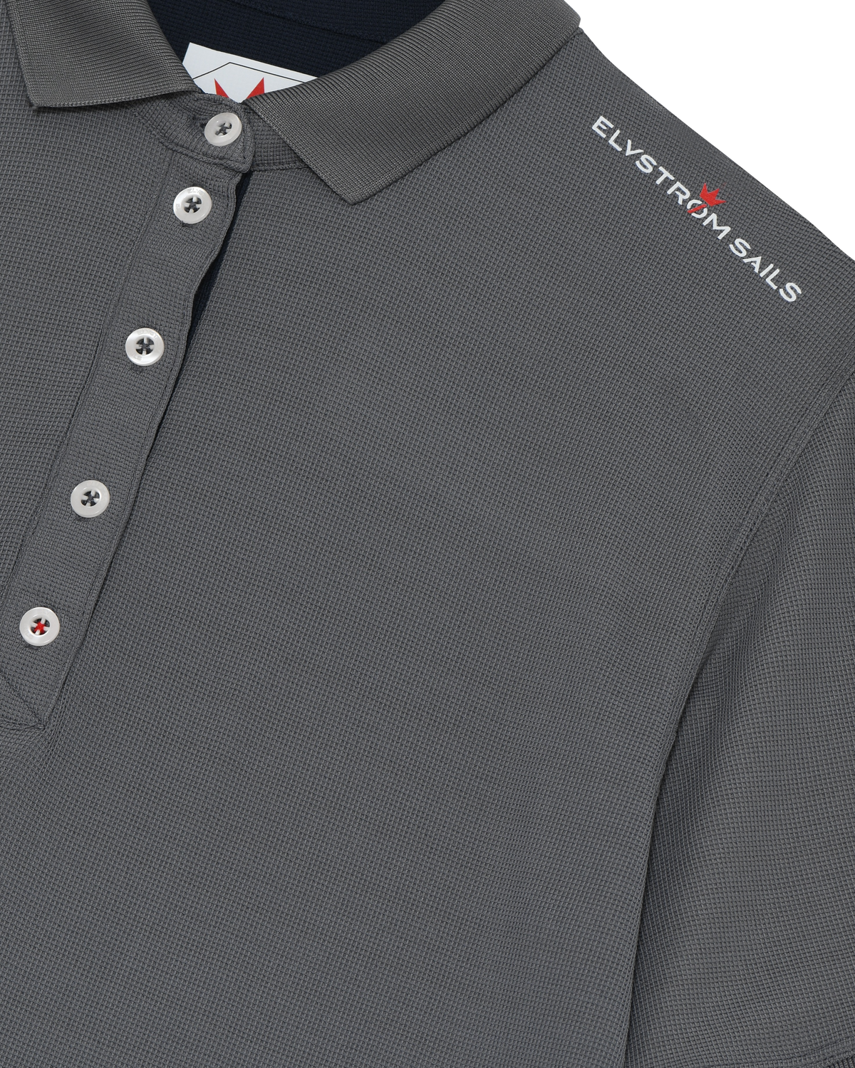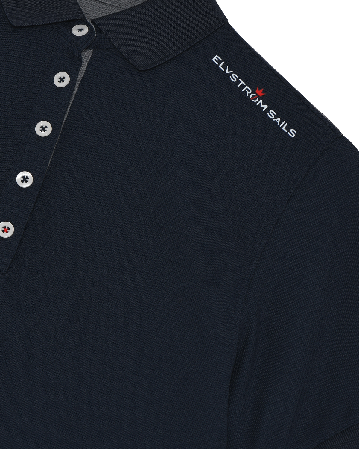 The Elvstrøm Sails logo is on the left shoulder, and the Elvstrøm Victory badge is on the lower left front. Red contrast details highlight the inside body slits and the back of the neck.